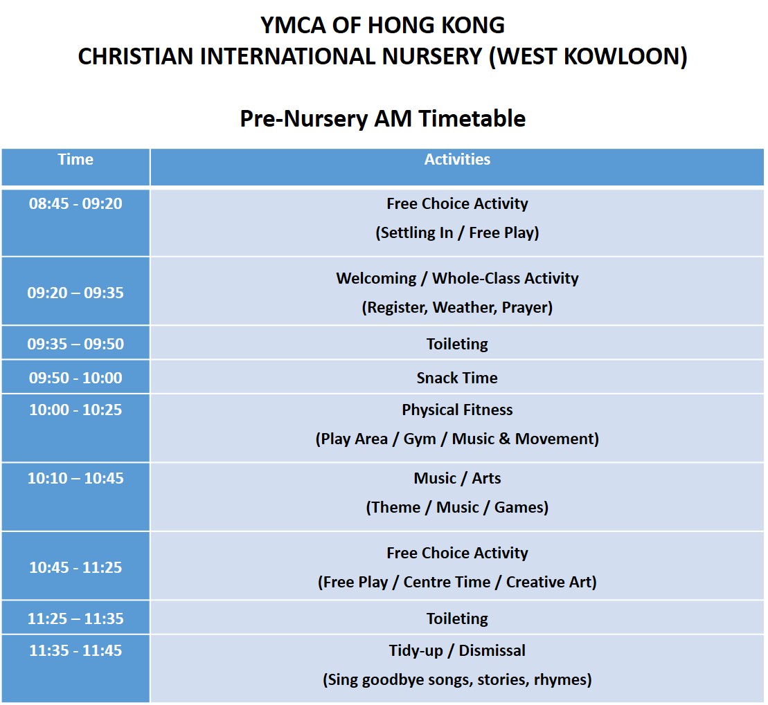 課堂內容包括有早上的點名時間、祈禱、主題教學、音樂及律動時間。為了增加學童日常體能運動的機會,他們亦會安排到室內運動場、室內遊樂場及課堂小組時間中進行活動。