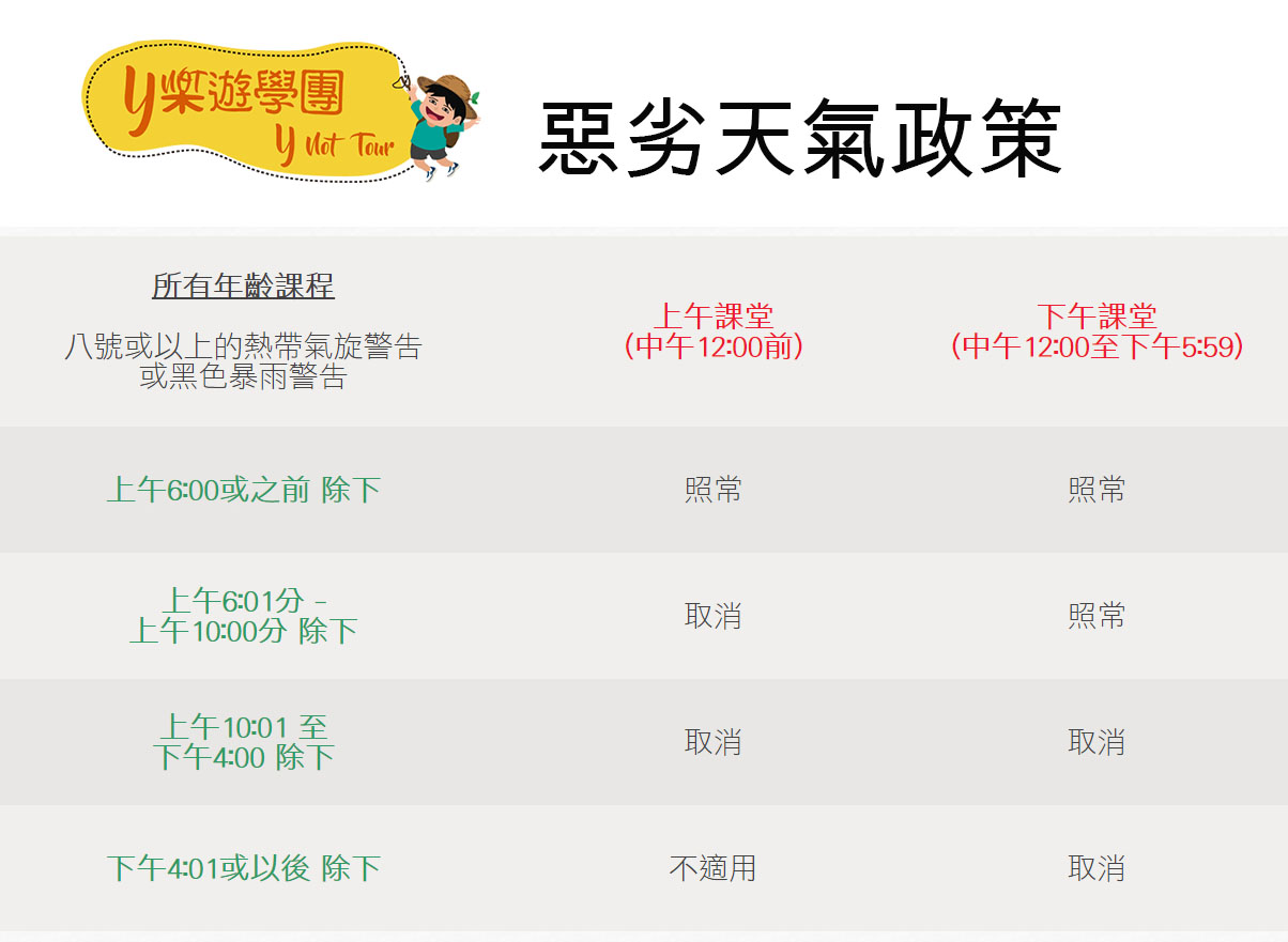 6. 如因天氣關係而取消當天課堂,該節費用將以代用劵退還。敬請留意以下惡劣天氣政策。